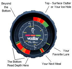 if your color blind Vexilar has solved that problem as well. First, look at the bottom left of the flasher, this indicates your bottom depth and everything inside the cone to the surface.